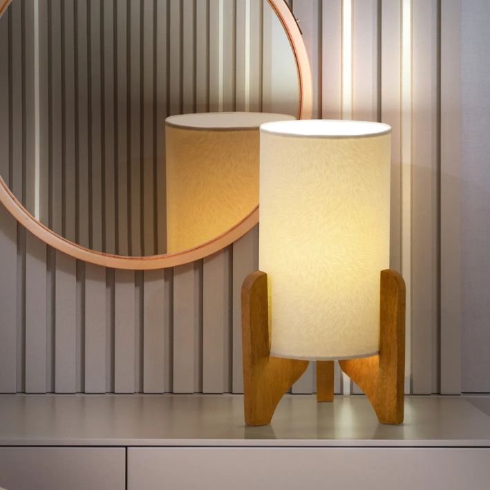 Descrição do Produto: Abajur de Mesa com Tela em Linho e Pés em Madeira
